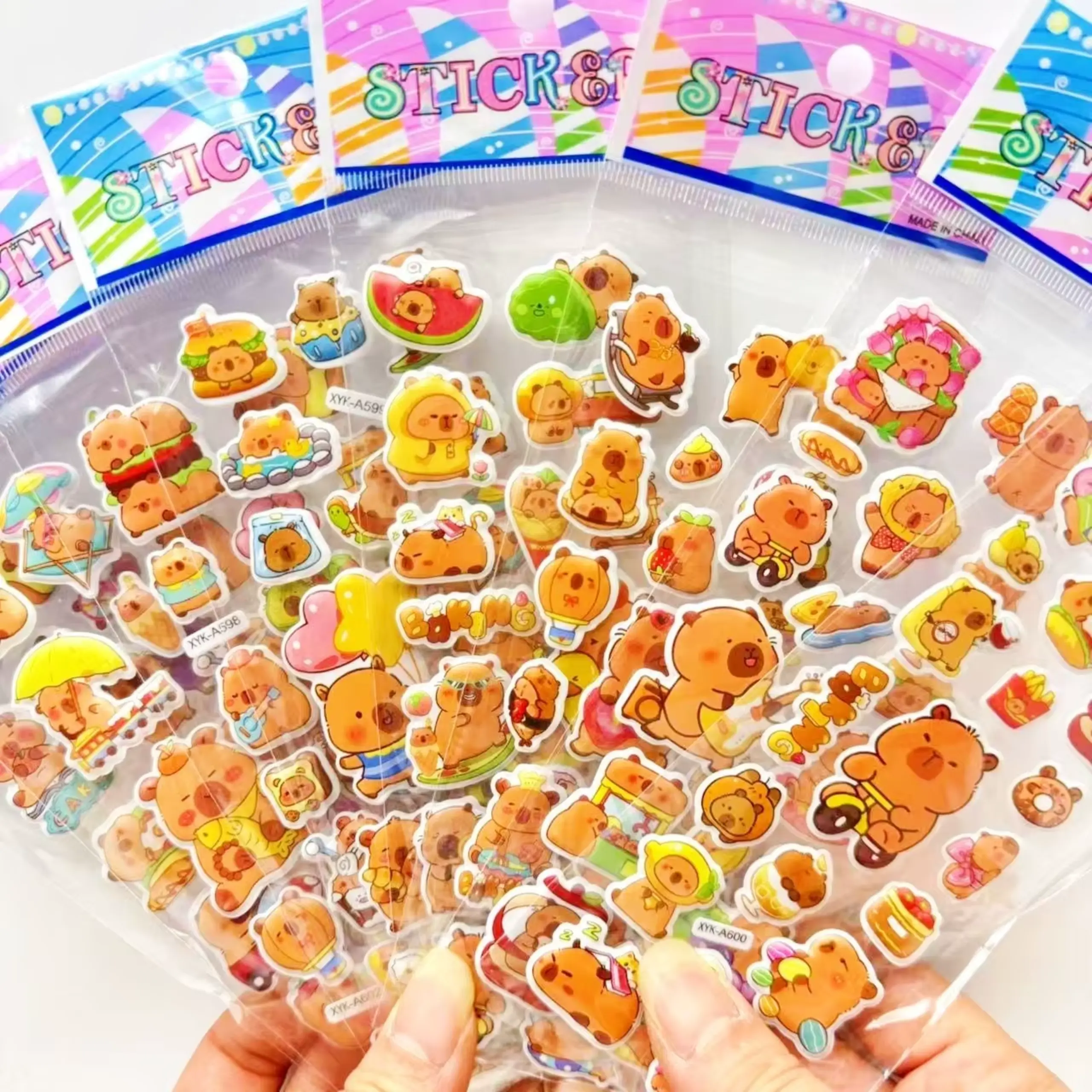 Wspaniały zestaw kolorowych naklejek 3D z uroczym bohaterem Kapibary! Idealne do ozdabiania zeszytów, notesów, plakatów, kartek okolicznościowych, plannerów czy prezentów.