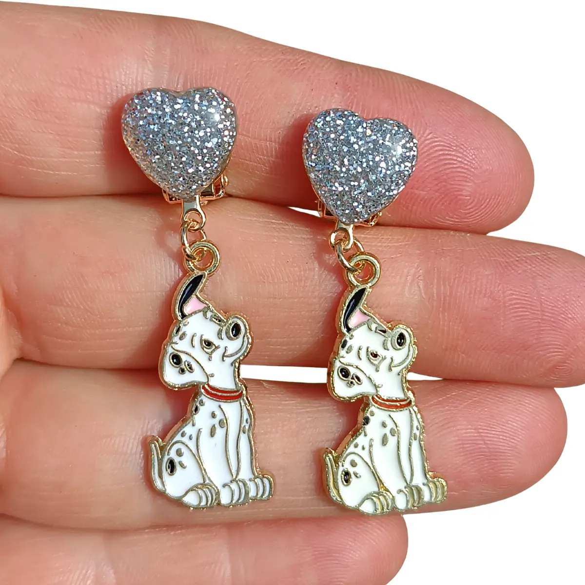 Klipsy dziecięce 101 DALMATYŃCZYKÓW ze srebrnymi serduszkami bez przekłuwania uszu